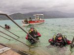 Die in rund 16 Metern Tiefe „versteckte“ Tauchpuppe konnte durch die Suchkette der Taucher gefunden werden. Die Feuerwehrboote aus Vöcklabruck und Seewalchen unterstützten die Taucher am Wasser.